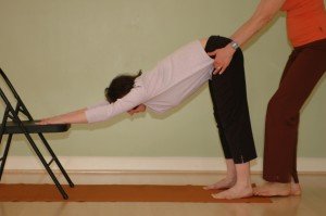 Partners can help by placing their hands at the very top of your partner’s thighs and pulling back gently, or if you’re comfortable in full Downward Dog Pose, s(he) may use a strap to apply gentle backward traction to the femurs.